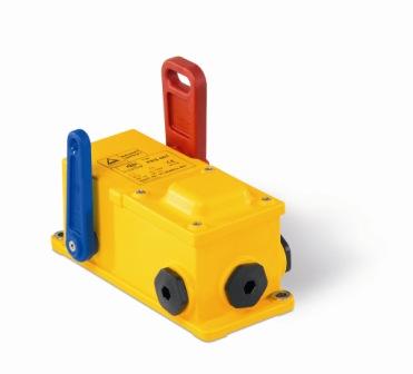 zweiseitig wirkender Seilzugnotschalter; kompaktes Kunststoff-Gehäuse; bis ca. 100m Reißleinenlänge